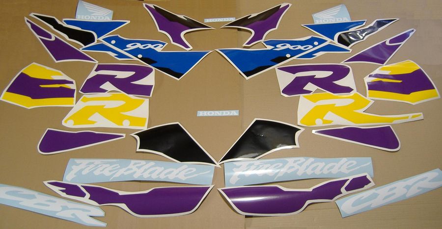Honda CBR 919RR 1997 yellow/black/purple version sticker set - this is a complete aftermarket decal set for the yellow/black/purple livery of the model and it includes all the decals for this bike.